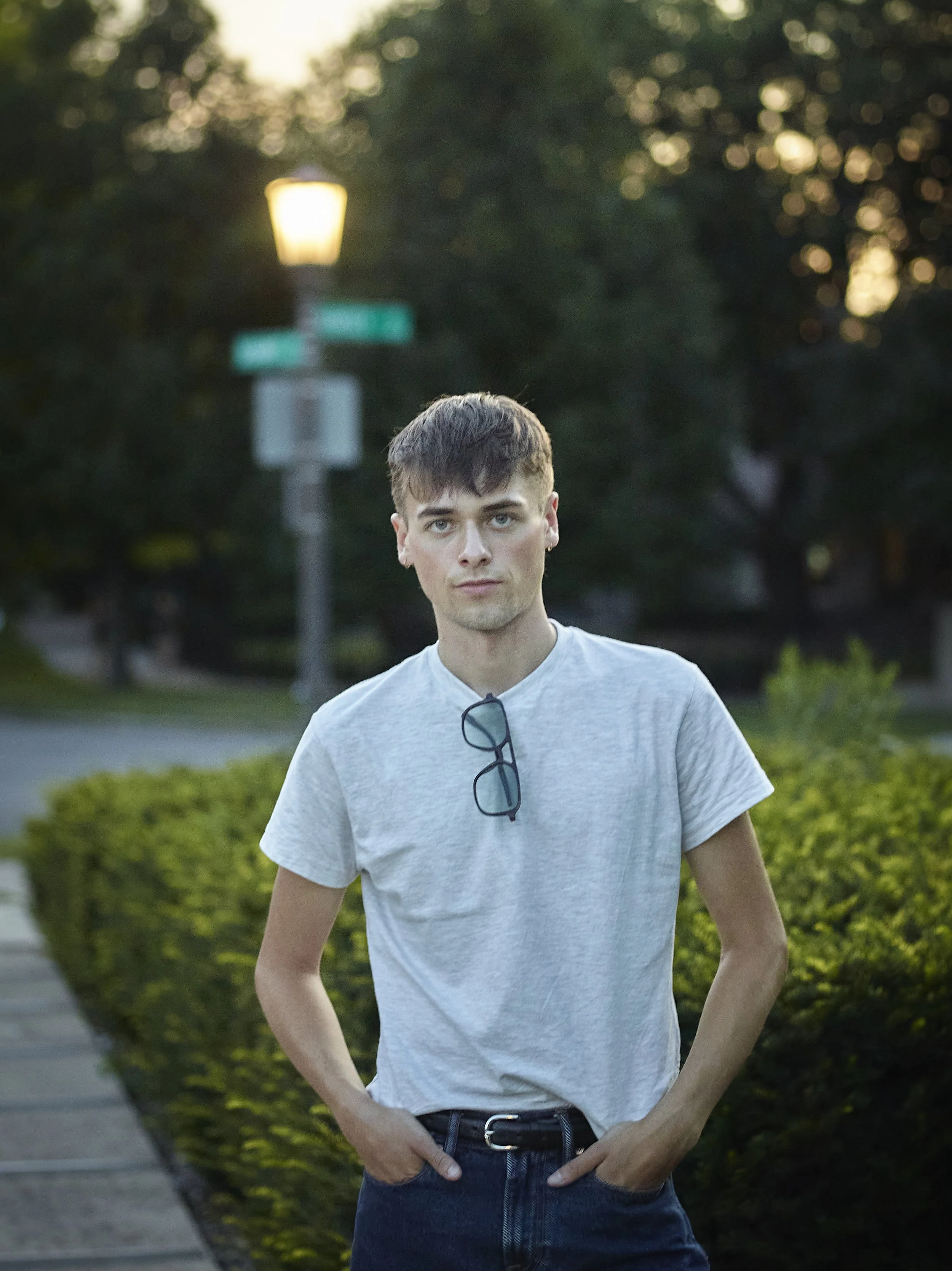 A young man with short brown hair and light skin stands outdoors during the evening, wearing a light gray t-shirt and dark jeans, with sunglasses hanging from the collar. He has his hands in his pockets and looks directly at the camera with a neutral